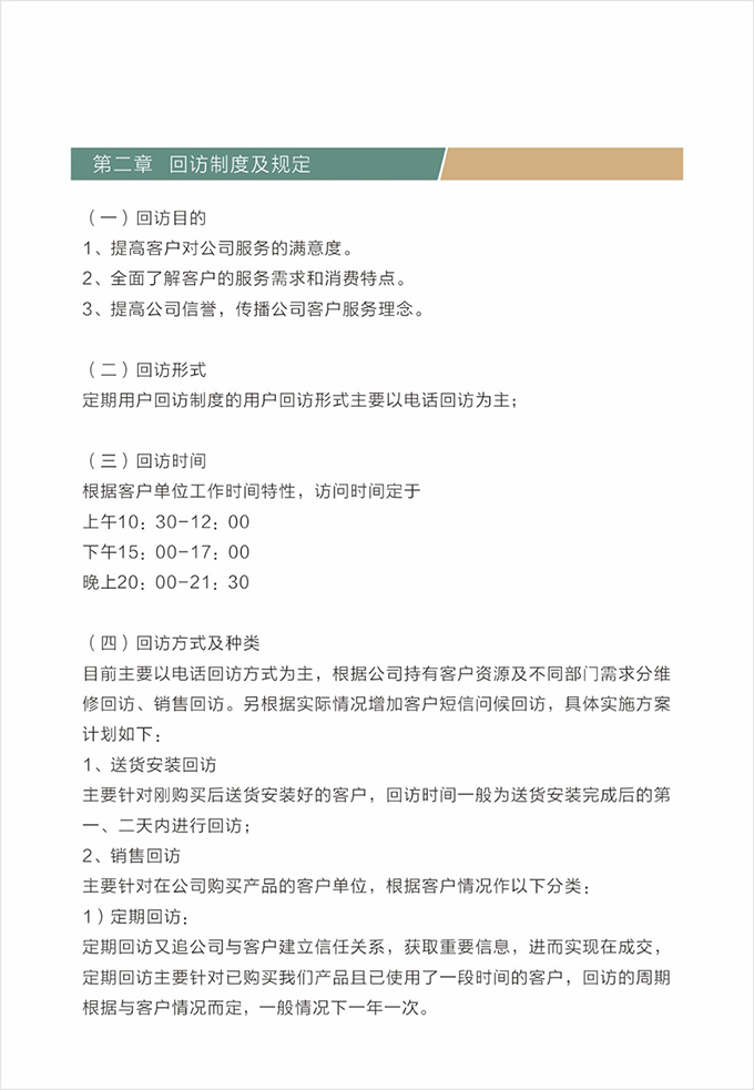 并将有客户签名的售后跟踪单交给店长。店长根据处理完成结果登记存档,并对客户进行回访,确定售后处理完成,并了解客户对公司整个服务过程的满意情况。作为对维修处理人员的考核内容之一。