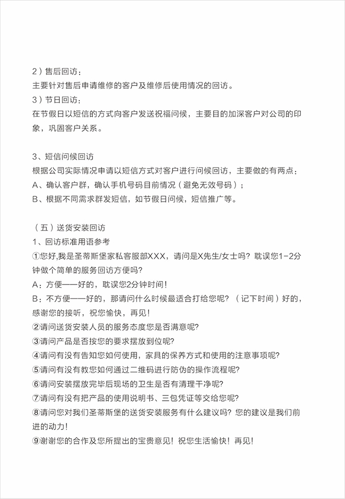 话术参考:“**先生/女士您好,我是乐鱼电竞的售后服务人员**,您购买的乐鱼电竞家具已经全部到货了,送货安装大约需要**时间,请问您这边什么时候方便我们上门送货安装呢?”同时要了解送货小区的电梯、楼道、入户门的尺寸等,提前做好准备,避免意外情况。最后确定送货时间(安装所需要时长),并告知客户安装人员的相关信息,可加微信发送,并发送配送安装流程说明。